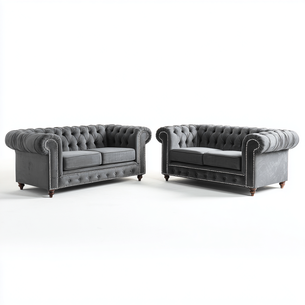 Questo set di divani è pensato per il soggiorno e si distingue per uno stile classico ispirato al design Chesterfield. Le sedute presentano dimensioni uniformi e una struttura solida, ideali per creare un ambiente elegante e accogliente.