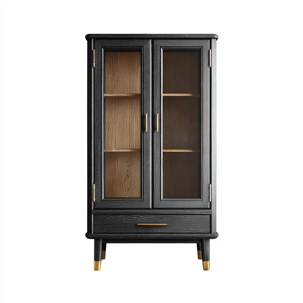 La struttura è realizzata in legno con finitura nera e marrone ed è abbinata a pannelli in vetro trasparente. La lavorazione accurata garantisce stabilità strutturale e una finitura uniforme adatta all'uso quotidiano.